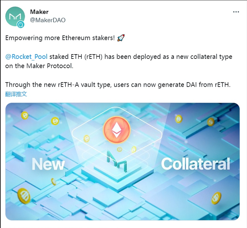 MakerDAO新增支持rETH(通过Rocket Pool质押以太坊生成的衍生Token)作为抵押资产,用户现可通过新的rETH-A金库,抵押rETH生成DAI。 此外,rETH-A金库的参数设定为:最低抵押率170%,稳定费1.5%,债务上限为500万枚DAI。