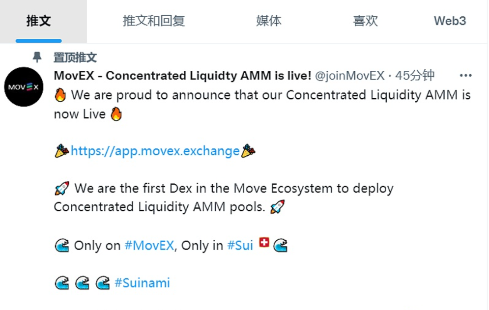 11月22日消息,据官方推特,Sui生态Dex MovEX表示,集中流动性AMM池现已启动。 据悉,MovEX为Move生态系统中第一个部署集中流动性AMM池的Dex。