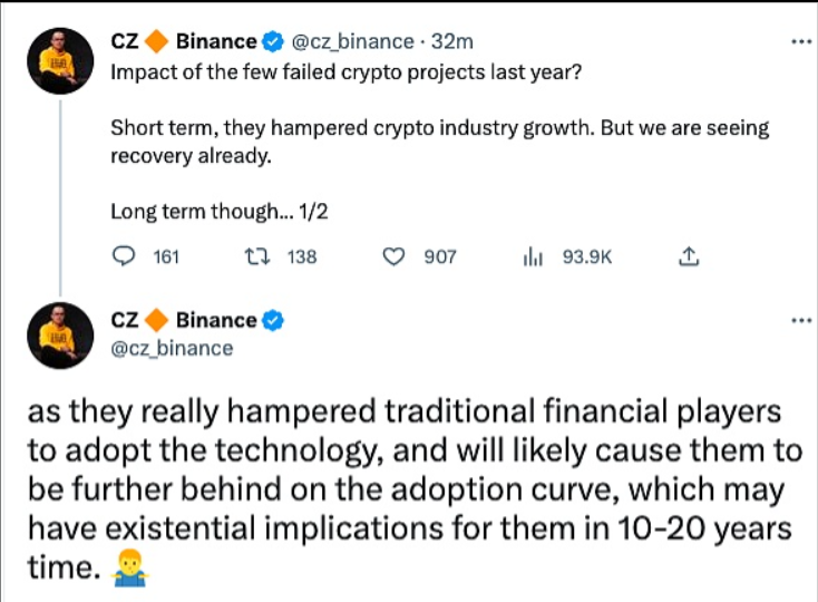 Binance首席执行官CZ在社交媒体上称,去年几个失败的加密货币项目的影响?短期内,它们阻碍了加密货币行业的增长。但我们已经看到了复苏。长期来看,因为它们确实阻碍了传统金融业者采用该技术,并可能导致他们在采用曲线上进一步落后,这可能会在10-20年后对他们产生生存影响。