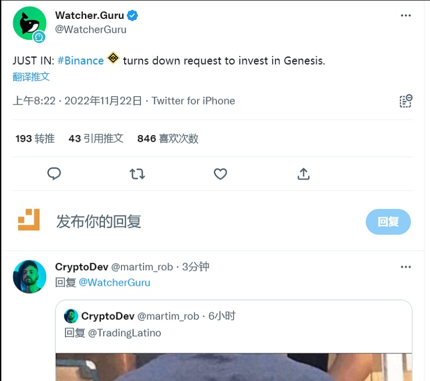 Watcher.Guru发推特透露,“Binance拒绝投资Genesis。” 知情人士透露,Genesis已与加密交易所币安接触,希望获得投资,并竞购其贷款账目。币安决定不投资,因为担心Genesis的一些业务可能会在未来产生利益冲突。