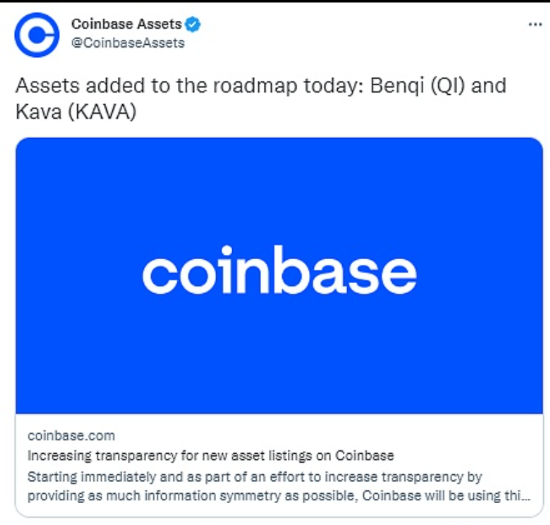 11月22日消息,据官方推特,Coinbase宣布将Benqi(QI)和Kava(KAVA)添加至资产上线路线图。 据悉,Benqi是一个建立在Avalanche上的借贷协议,QI是协议的治理代币;Kava是一个跨链DeFi平台,提供主流数字货币的抵押借贷。