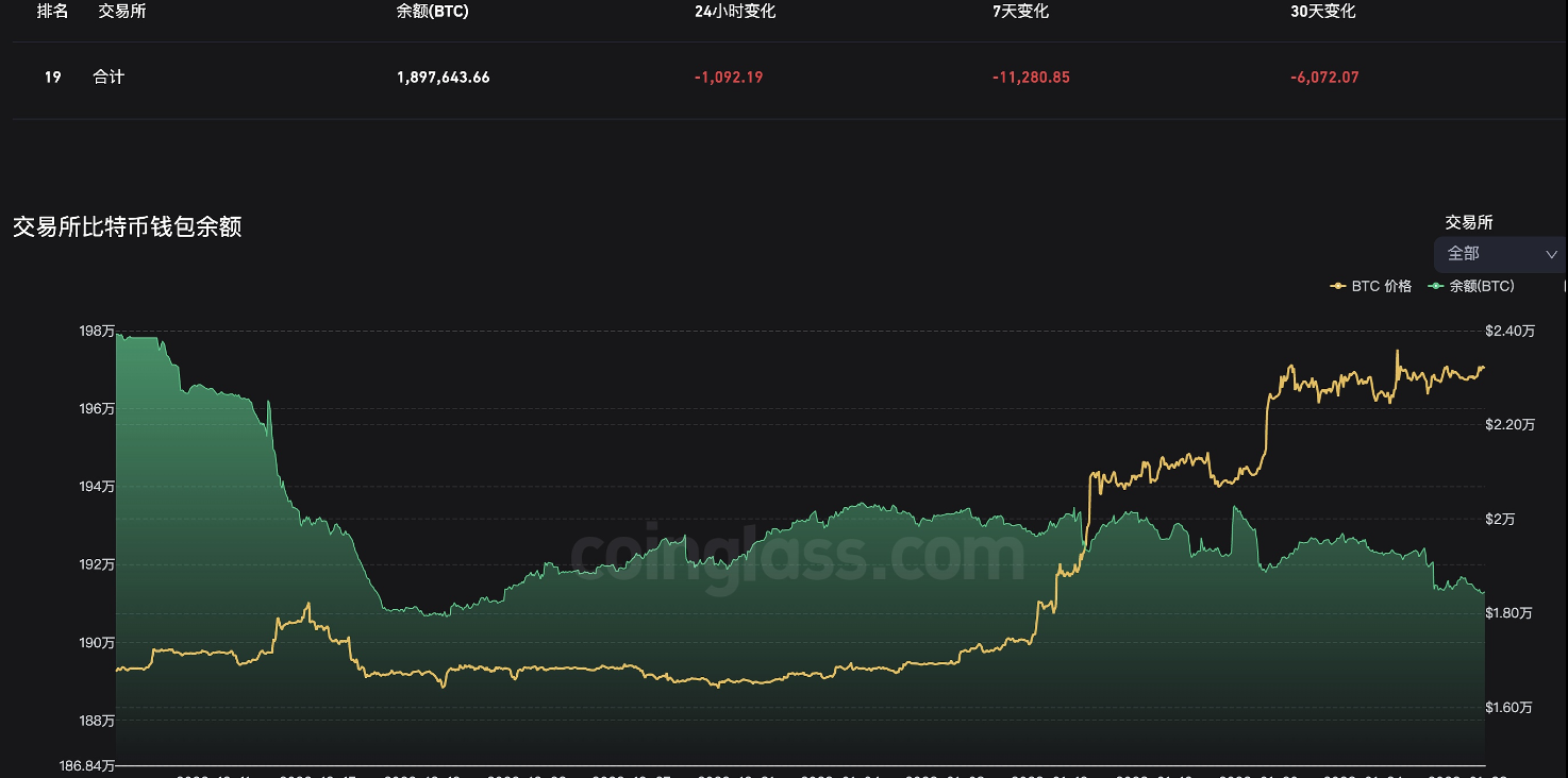 据coinglass数据显示,交易所钱包余额近24小时流出1,092.19枚BTC,近7天流出11,280.85枚BTC,近30天流出6,072.07枚BTC。目前全网交易所钱包余额总计为1,897,643.66枚BTC。