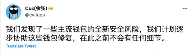 慢雾科技创始人余弦在社交媒体上发文表示,我们发现了一些主流钱包的全新安全风险,我们计划采取措施帮助这些钱包修复,在此之前不会有任何细节。