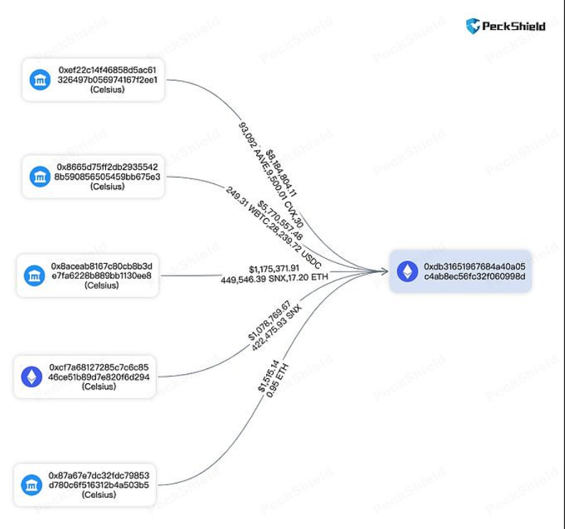 1月29日消息,据 PeckShield 数据监测,价值 1620 万美元的加密货币于 1 月 26 日从 Celsius 的地址转移到「0xdb31」开头地址(疑似清算人钱包),其中包括 9.3 万枚 AAVE、9400 枚 CRV、249 枚 WBTC、2.8 万枚 USDC、18 枚 ETH 和 87.2 万枚 SNX。