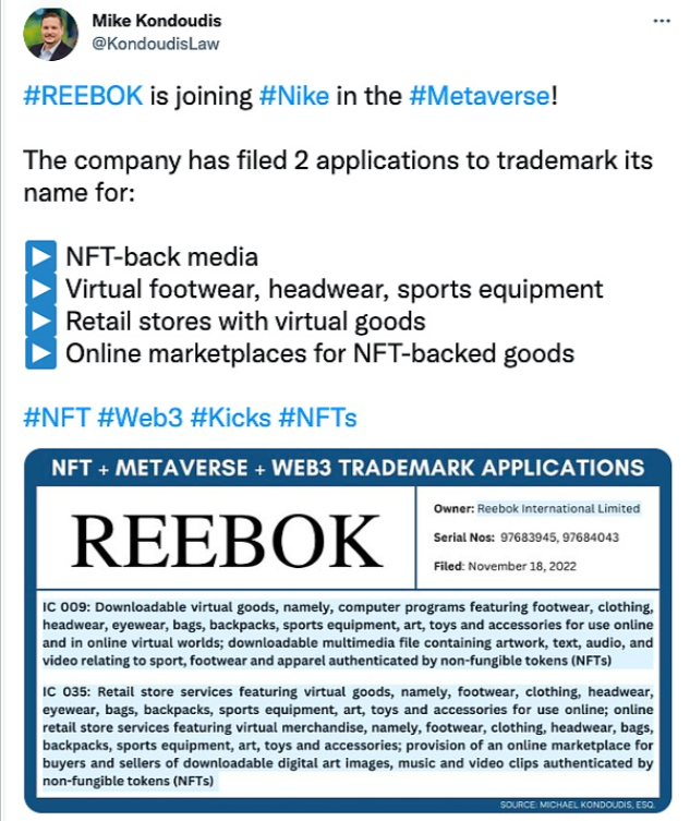 美国商标律师Mike Kondoudis在社交媒体上称,体育用品公司REEBOK正在加入Nike在元宇宙的行列,该公司已提交了2份商标申请,涵盖NFT支持的媒体、虚拟鞋类、头饰、运动设备、虚拟商品的零售店以及NFT支持商品的在线市场。