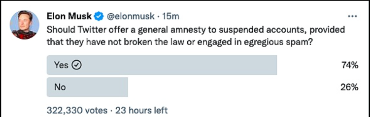 马斯克在推特上发起投票:推特是否应该解封被封账号,前提是这些账户没有违法或与垃圾邮件用户无关?目前74%的投票用户支持解封被封账号。