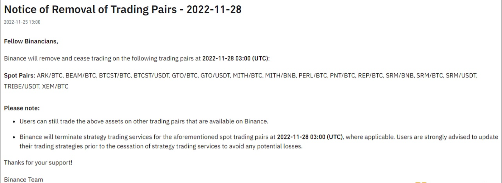 据官方消息,Binance宣布将于11月28日11:00下架ARK/BTC、BEAM/BTC、BTCST/BTC、BTCST/USDT、GTO/BTC、GTO/USDT、MITH/BTC、MITH/BNB、PERL/BTC、PNT/BTC、REP/BTC、SRM/BNB、SRM/BTC、SRM/USDT、TRIBE/USDT、XEM/BTC现货交易对。
