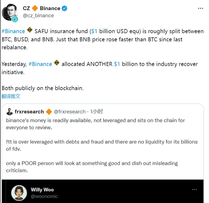 CZ在社交平台回应SAFU保险基金构成问题时表示,Binance SAFU保险基金(10亿美元等值金额)大致分为BTC、BUSD和BNB。而自上次再平衡之后,BNB价格的上涨速度快于BTC。 此外,10亿美元行业复苏基金将全部为BUSD。SAFU保险基金和行业复苏基金的持仓均在区块链上完全公开。 此前报道,11月24日,CZ在接受彭博社直播采访中表示,Binance将设立一个约10亿美元规模的基金,用于购买加密领域不良资产。