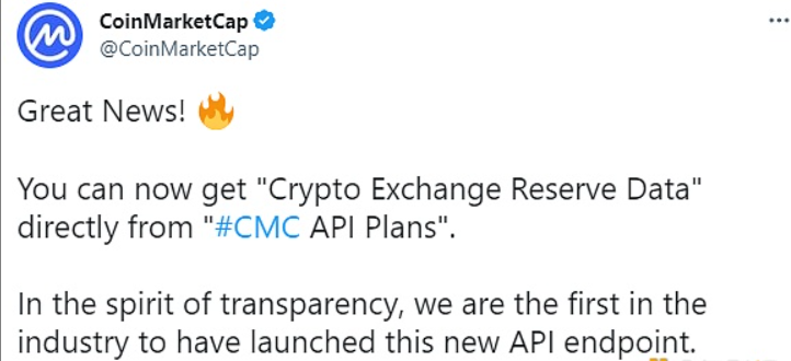 CoinMarketCap宣布推出交易所储备数据API,开发者可通过该API获取各个交易所储备数据更新。 此前报道,CoinMarketCap增加交易所储备展示板块功能。