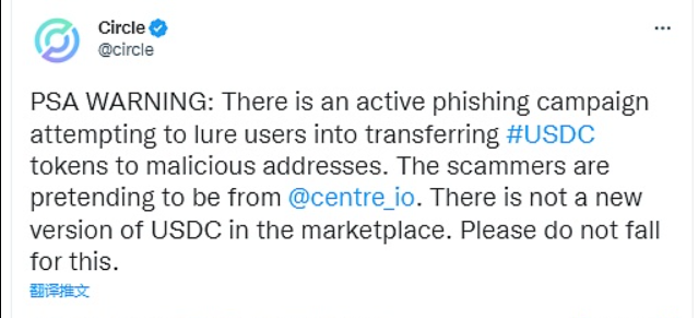 美元稳定币 USDC 发行方 Circle 在社交媒体发布安全警告,表示有一个活跃的网络钓鱼活动试图引诱用户将 USDC 转移到恶意地址,欺诈者谎称来自于 Circle 和 Coinbase 联合发起的开源技术项目 Centre.io,并声称将发行新版本 USDC。Circle 提醒用户该机构从来没有发行任何“新版本 USDC”,所有敦促用户迁移代币的消息都是假的,不要上当受骗。