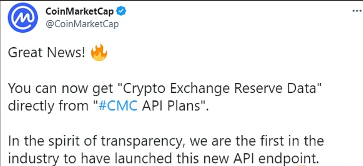 CoinMarketCap宣布推出交易所储备数据API,开发者可通过该API获取各个交易所储备数据更新。 此前报道,CoinMarketCap增加交易所储备展示板块功能。