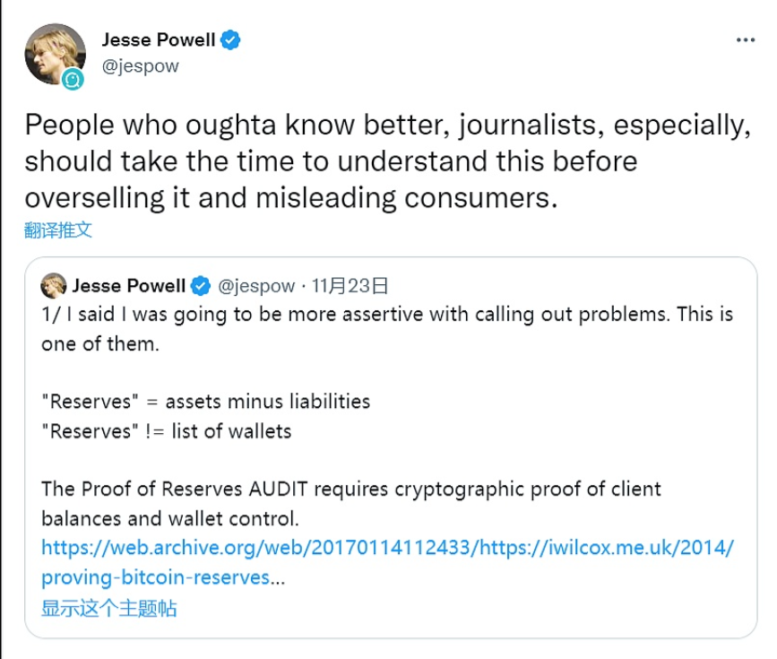 11月26日消息,Kraken首席执行官Jesse Powell发推表示,完整的准备金证明审计必须包括客户负债总额、用户可验证的密码证明(表明每个账户都包含在总额中)以及证明保管人对钱包的控制权的签名,“默克尔树储备金证明没有包含负债总额,就毫无意义“。 此前报道,币安宣布上线资产储备证明系统,并且采用默克尔树数据结构,将保持用户资产透明的工作推向一个新的进程。该系统上线之初将提供用户BTC资产证明,未来几周将逐步支持更多资产和网络。