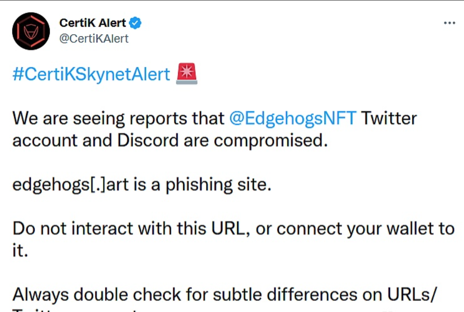 11月26日消息,据CertiK监测,NFT项目Edgehogs的Twitter和Discord账号均已被盗。edgehogs[.]art是一个钓鱼网站。不要与此URL交互,或者将钱包连接到此URL。