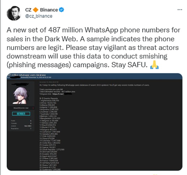币安首席执行CZ发推表示,4.87亿个新的WhatsApp电话号码被用于暗网销售。据样本表明,电话号码是合法的。CZ强调,“请保持警惕,这些电话号码或将被用于进行网络钓鱼活动”。