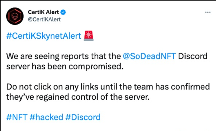 据CertiK监测,SoDeadNFT项目Discord服务器遭到攻击。请社区用户在服务器修复之前不要点击任何链接。