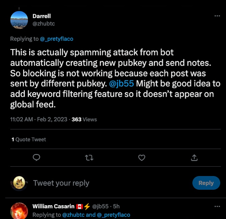 2月2日消息,去中心化社交协议 Nostr 核心开发者 William Casarin 在推特评论回复称,针对 Damus 近期出现的机器人垃圾邮件攻击问题,将上线关键字过滤功能。