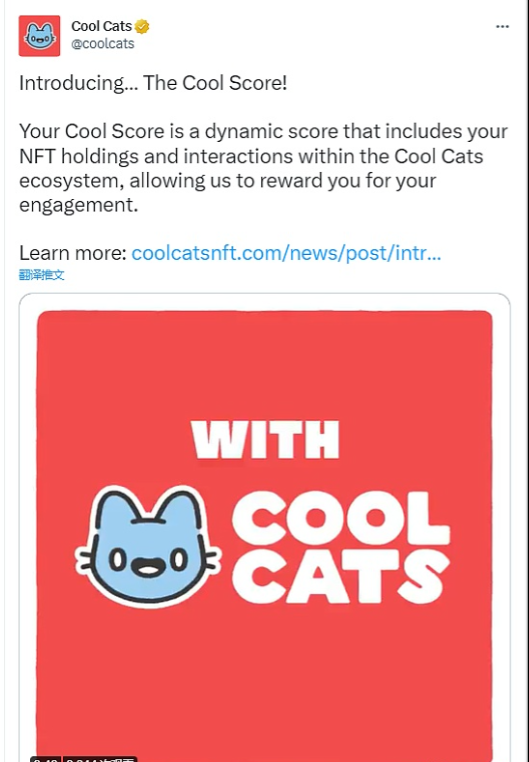 NFT 项目 Cool Cats 在社交媒体宣布推出名为“Cool Score”的评分和奖励系统,旨在奖励 Cool Cats 社区的忠诚和活跃成员。Cool Score 评分和奖励系统添加了游戏化机制,这些机制将控制未来藏品投放、IRL 活动、VIP 福利机会和其他产品的访问权限。Cool Cats 表示,评分参考标准包括:持有 Cool Cats NFT 时长、酷宠是否完全进化、在 Cooltopia 中囤积的物品类型、社区参与度等,目前 Cool Cats 持有者已经可以将钱包连接到网站来访问和查看自己的 Cool Score 分数。另据 NFTGo.io 数据显示,当前 Cool Cats NFT 地板价已升至 2.24 ETH,过去 24 小时上涨 12%。
