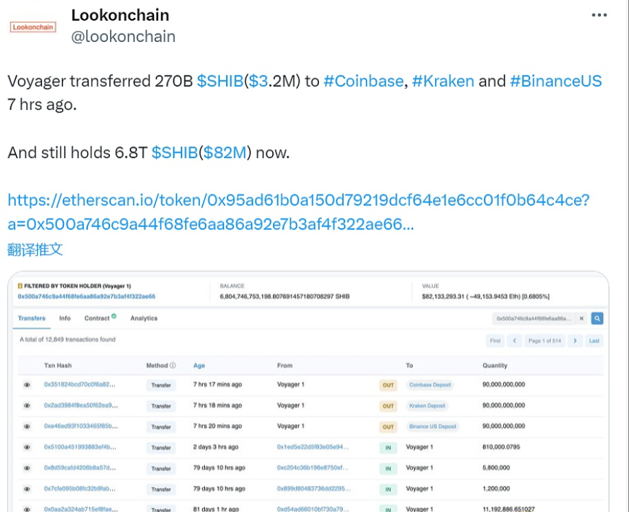 据Lookonchain监测数据显示,Voyager在7个小时前向#Coinbase、#Kraken和#Binance US转入2700亿SHIB,价值约(320万美元)。现在仍然持有6.8万亿SHIB(8200万美元)。