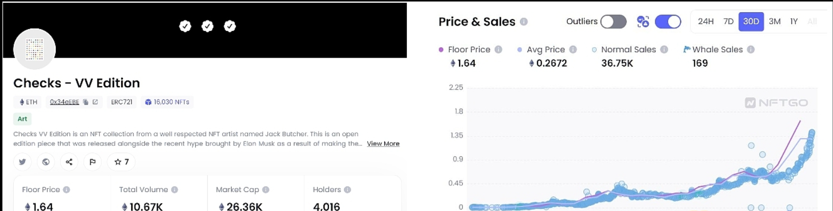 根据NFTGo.io数据,Checks – VV Edition 总成交量超过10K ETH,当前地板价为1.63ETH,24小时涨幅75.43%,24小时交易量排列第一。 Checks – VV Edition 由NFT艺术家 jackbutcher 创作,作品形式为一张无限的表达画布,旨在挑战互联网时代的所有权和作者身份概念。