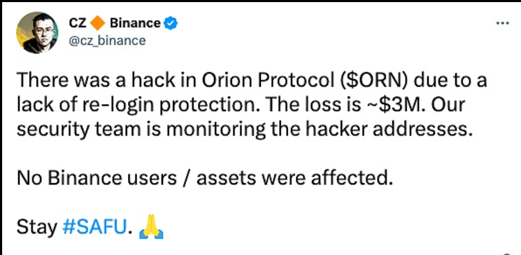 2月3日消息,CZ在其社交平台表示,针对早前Orion Protocol被攻击事件,Binance 安全团队正在监控 Orion Protocol 黑客地址。Binance 用户和资产不受此次事件影响。 金色财经此前报道,去中心化流动性聚合器协议 Orion Protocol 遭到重入攻击,损失约 300 万美元资产,攻击者已将部分加密货币转入 Tornado Cash。该平台已暂时关闭存款功能。