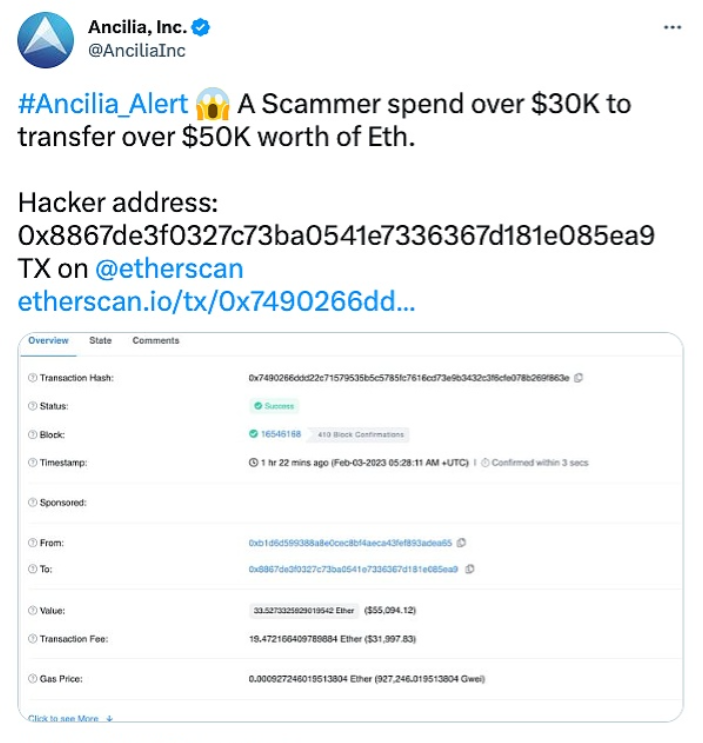 据Ancilia监测,以0x8867开头的某黑客地址在转移盗取的约53枚以太坊时支付了约19.472 枚以太坊(价值约3.2万美元)的Gas费,最终仅转移了约33.5枚以太坊(价值约5.5万美元)。 注,Binance Labs 于 2022 年 10 月宣布领投 Web3 网络安全公司 Ancilia Pre-Seed 轮融资,融资金额未披露。