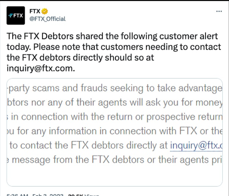 2月3日消息,今日FTX在推特上分享了FTX债务人的一份警报,我们意识到活跃的第三方诈骗和欺诈行为试图利用FTX客户。请注意,无论是FTX债务人或他们的任何代理人都不会要求您提供与客户资产返还或预期返还有关的金钱、费用、付款或您的账户密码。若您收到讯息,要求你提供任何与FTX或FTX破产程序有关的资料,在提供任何该等资料前,请立即与FTX债务人联络,以确认该等讯息是否合法。