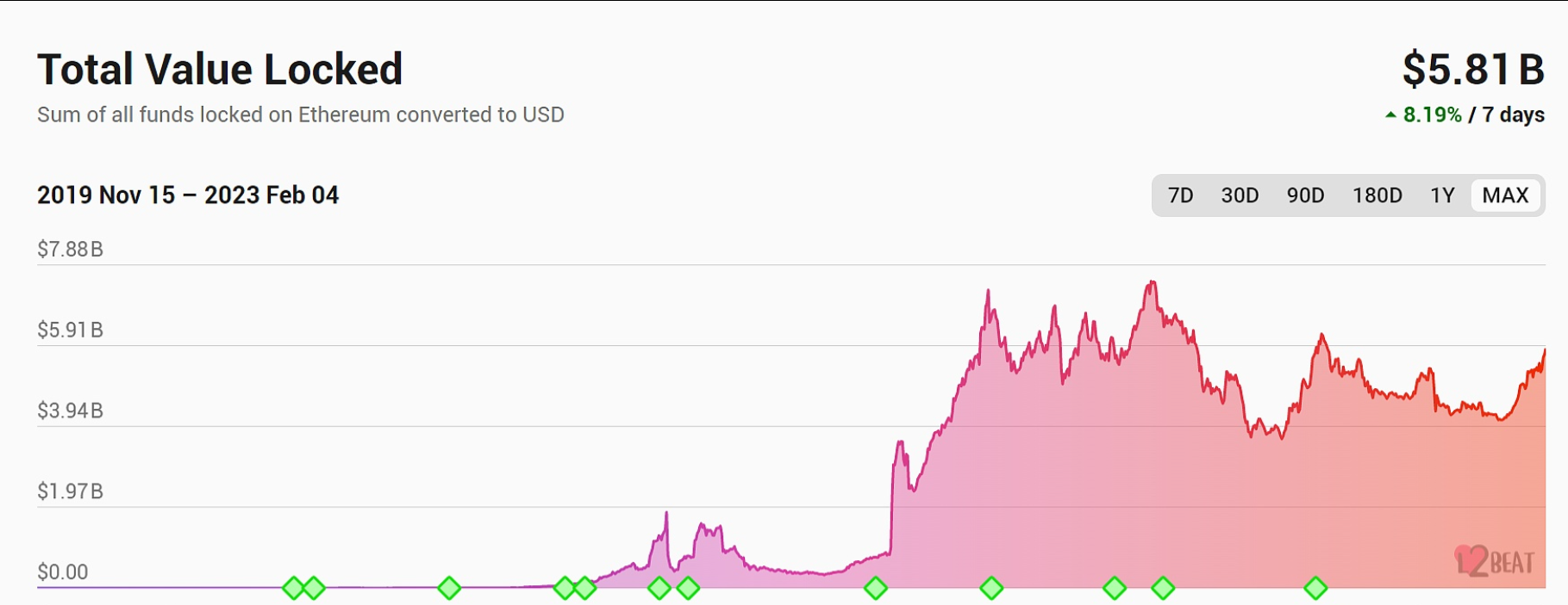 L2BEAT数据显示,截至目前,以太坊Layer 2上总锁仓量为58.1亿美元,近7日涨幅8.91%。其中锁仓量最高的为扩容方案Arbitrum One,约28.7亿美元,占比49.43%,其次是Optimism,锁仓量19.2亿美元,占比33.04%。