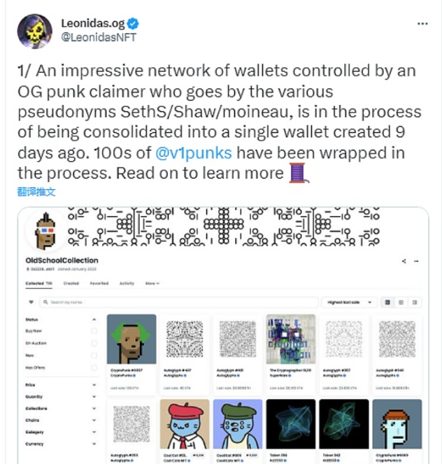 据 NFT KOL @Leonidas 在社交媒体透露,匿名 NFT 巨鲸“Seths”从上周开始将其 NFT 转移到一个名为“OldSchoolCollection”的新钱包,但不清楚该巨鲸执行此操作目的。当前该钱包已整合了 673 个 CryptoPunks V1(240 个未封装) 247 个 Art Blocks 、213 个 CryptoPunks(1 个 Alien,3 个 Ape)、136 个 MoonCats(123 个未封装)、以及 16 个 Autoglyphs。截止目前,Seths 已成为第四大 CryptoPunks 持有者(排名高于 Yuga Lasb)、第四大 CryptoPunks V1 持有者和第五大 Autoglyph 持有者,,如果再收集 6 枚 CryptoPunk,他将成为最大的 Punk 持有者。