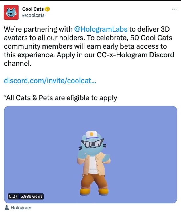 2月4日消息,据Cool Cats在社交媒体披露,该NFT项目已与Hologram Labs达成合作,为所有Cool Cats和Cool Pets NFT持有者提供3D头像。Cool Cats表示,虽然平面2D图像也适用于个人资料图片,但在AR和元宇宙友好的虚拟世界中,用户需要可互操作的3D化身,与Hologram Labs的合作将使Cool Cats社区成员能在多个场景中展示他们的酷猫,该项目对50名社区成员开放了早期测试版访问权,目前可在官方Discord上进行申请。