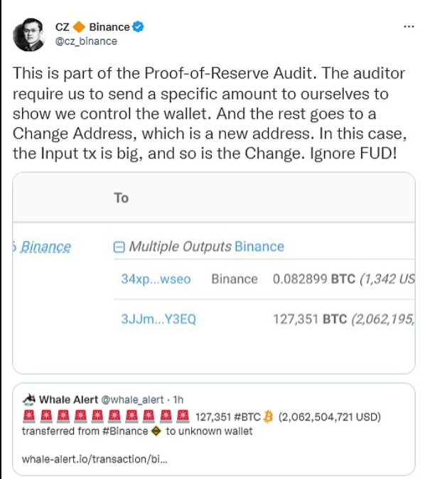 11月28日消息,此前币安一存储了超 12 万枚比特币钱包的地址将钱包内绝大多数比特币(127,351 枚比特币,价值超 20 亿美元)转至新地址。赵长鹏回应称,此举是应审计员要求证明币安对该地址具有控制权,而将该地址内比特币转移至新地址中。