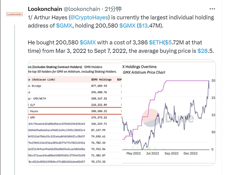 Lookonchain监测数据显示,BitMEX 创始人Arthur Hayes目前是GMX 最大的个人持有者地址,共计持有200,580枚 GMX(约1347万美元),其中集中在2022年3月3日到2022年9月7日期间,共花费3386枚 ETH(当时为572万美元)的成本,平均购买价格为28.5美元。 此外,Arthur Hayes 获得了344.5枚 ETH(约55.8万美元)和12,405枚 esGMX(约81.8万美元)的奖励,以最近价格计算,Arthur Hayes 在 GMX 上的利润接近900万美元。