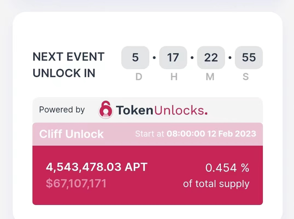 Token Unlocks数据显示,公链项目Aptos将于北京时间2月12日8:00解锁4,543,478.03枚APT,占总供应量(10亿枚)的0.454%。其中,社区解锁3,210,145枚,基金会解锁1,333,333枚。
