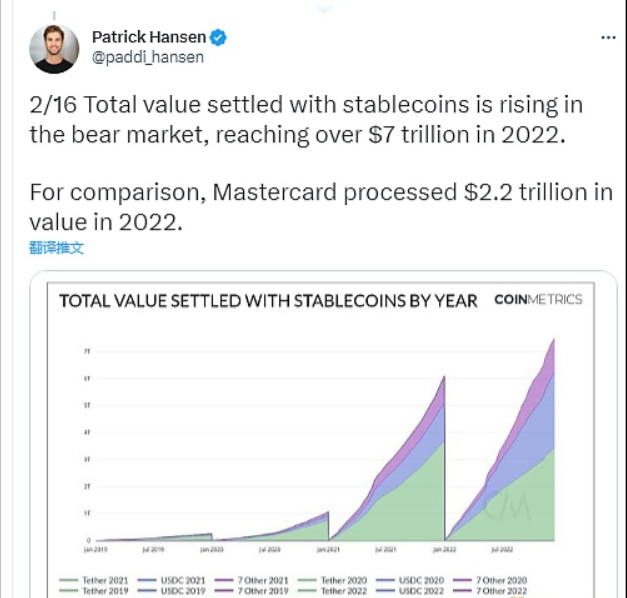 Circle欧盟战略与政策总监帕特里克·汉森在社交媒体发文称,即便在2022熊市期间,稳定币结算规模超过了7万亿美元,而万事达卡则为2.2万亿美元,83%的商家优先考虑稳定币支付。此外,相比于暴跌的DeFi锁仓量,稳定币绝对市值近下跌了5.7%。从2022年7月16日开始,USDC 投机性甚至低于美元 (M2),只有大约15%的USDC交易是钱包到钱包的转账,与传统支付系统中观察到的2% 非金融化转账相比,这一比例相对较高,下半年去中心化交易所约45%的流动性由稳定币提供。