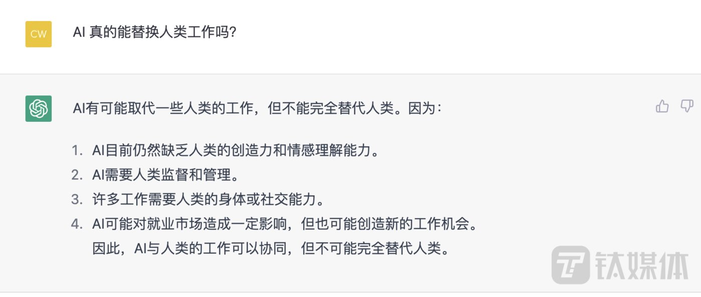 不过,钛媒体App在ChatGPT输入相关问题时,得到的答案是:“AI有可能取代一些人类的工作,但不能完全替代人类。”