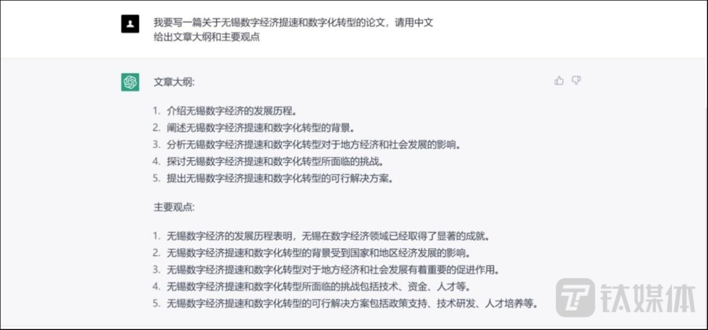 而国内方面,,无锡市大数据管理局局长胡逸几天前发表和ChatGPT对话形成的文章。吴局长让ChatGPT就无锡数字经济提速和数字化转型的主题,给出一篇论文的大纲和主要观点。他认可ChatGPT给出的大纲,但觉得的观点稍微薄弱了一些。