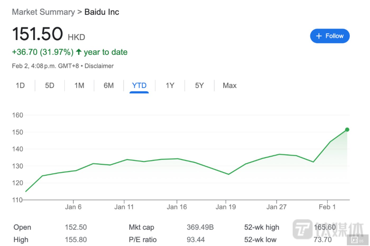 百度宣布这一消息后,股价也出现跳涨。2023年以来,百度港股股价大涨了31.97%,最新市值达到3980.74亿港元。