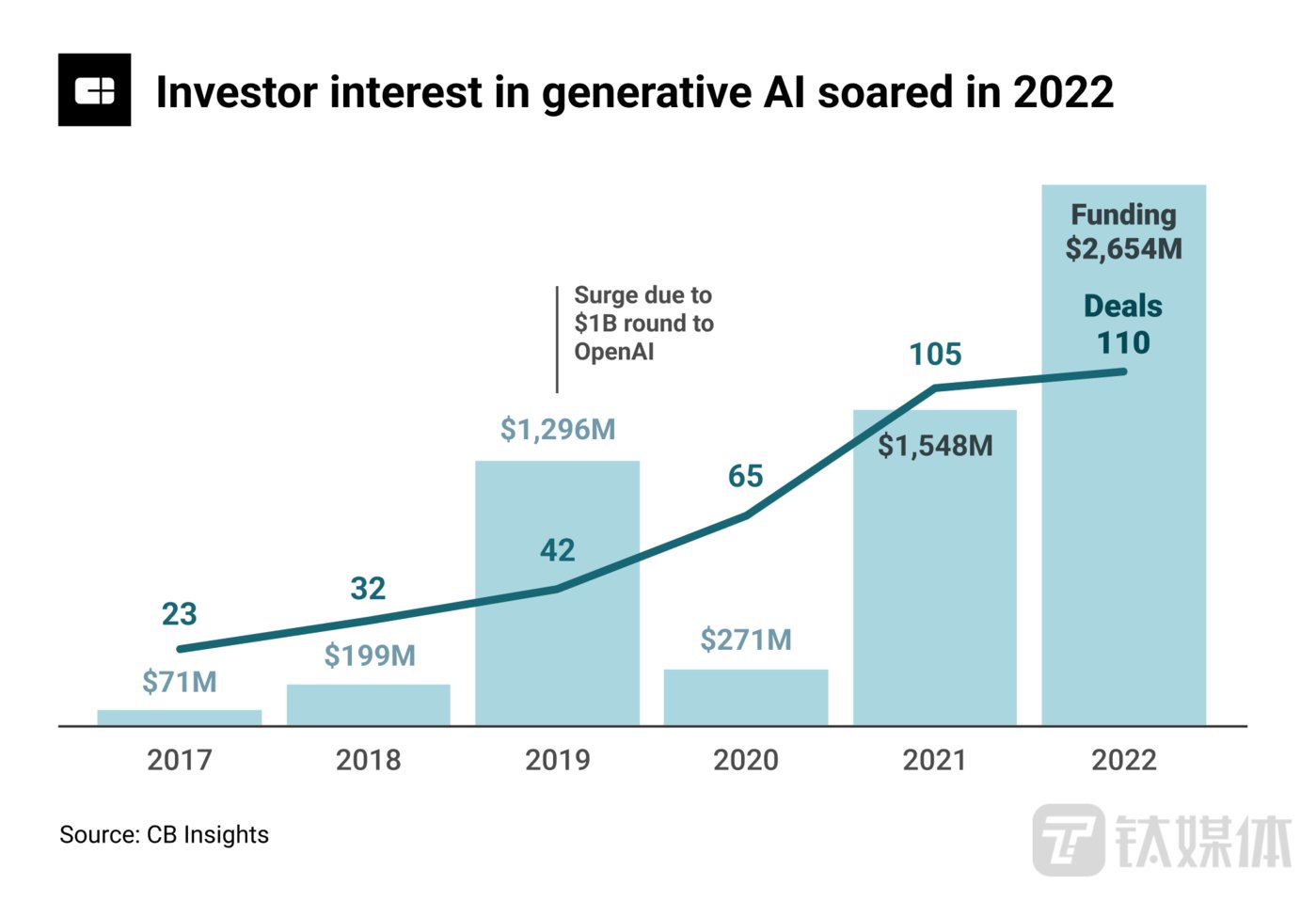 2022,投资人对生成式AI 兴趣飙升,在110笔交易中投资26.54亿美元(来源:CB insights)