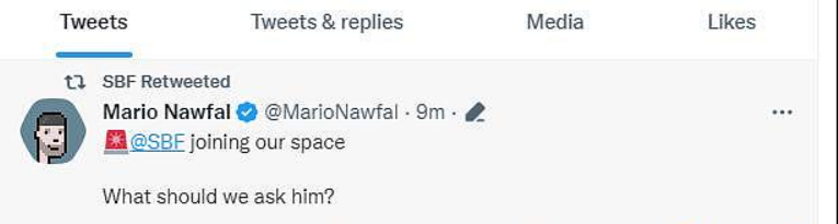 11月29日消息,FTX前首席执行Sam Bankman-Fried(SBF)在推特上转载了迪拜风投公司IBC Group创始人Mario Nawfal的推特,推特内容为“SBF将加入我们的Space,我们应该问他什么?”。