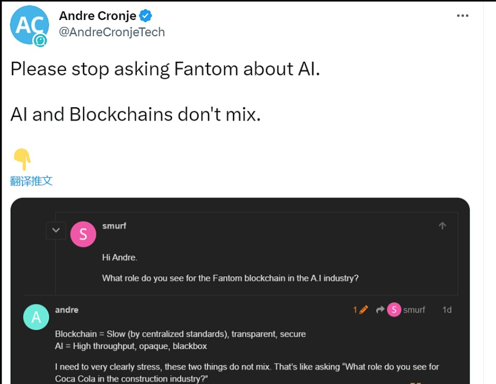 2月9日消息,Fantom创始人Andre Cronje在推特上回应,Fantom不会涉足AI,区块链和AI不能结合。具体针对“Fantom区块链在人工智能行业中扮演什么角色?”的提问,他回答,区块链=慢(按照中心化的标准来看)但透明安全,Al=高吞吐量、不透明、黑盒。 这两件事不能混为一谈。这就像问“你认为可口可乐在建筑行业中扮演什么角色?”区块链和Al不是互补的。目前任何人都想蹭“AI”的热点。如果你看到一个项目突然“转向Al”,这只意味着他们可能“快死了”……区块链不会改善Al,而Al也没有改善区块链。
