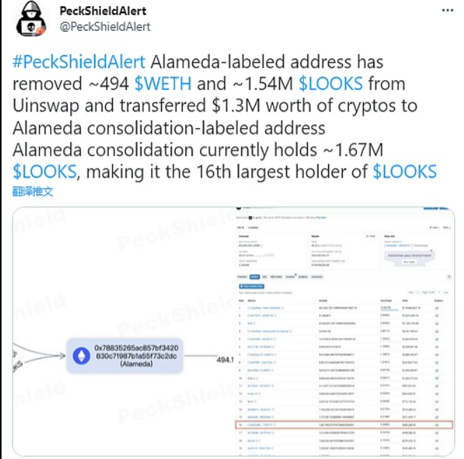 派盾(PeckShield)监测显示,标记为Alameda的地址已经从Uinswap中移除494枚WETH和154万枚LOOKS,并将价值130万美元的加密货币转移到Alameda整合标记地址。目前该地址持有约167万枚LOOKS,是LOOKS的第16大持有者。