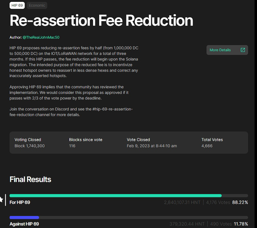 据官方消息,Helium 基金会通过投票表决,通过将 re-assertion 费用减半的提案 HIP-69。HIP 69 提议将 IOT/LoRaWAN 网络上的 re-assertion 费用减少一半(从 100 万 DC 减少到 50 万 DC),共三个月。该项提案将于 Helium 向 Solana 网络迁移时生效。