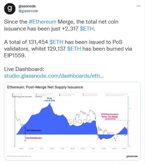 Glassnode数据显示,自以太坊合并以来,总净发行量仅为2,317 ETH。总共向PoS验证者发放了131,454个ETH,同时通过EIP1559销毁了129,137个ETH。明年3月开放质押提现后,可能会发生变化。