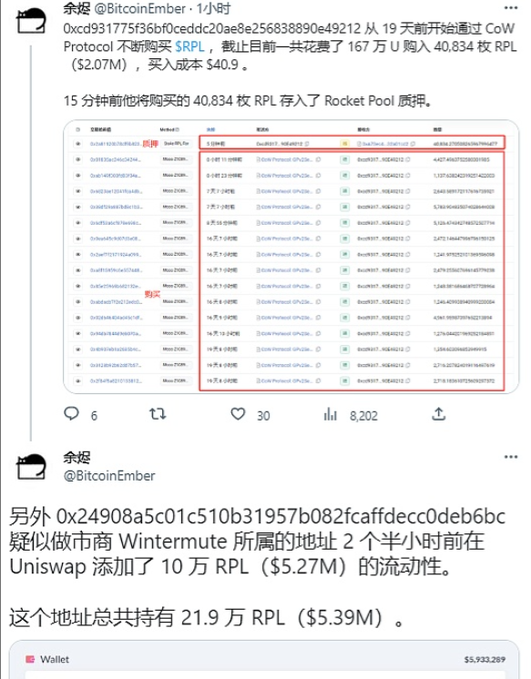 据推特用户余烬监测,0xcd93开头地址19天前开始通过CoW Protocol花费约167万美元购买40834枚RPL,并将RPL存入Rocket Pool进行质押。 此外,疑似属于做市商Wintermute地址(0x2490开头)在Uniswap添加10万枚RPL(527万美元)的流动性,该地址共持有21.9万枚RPL。