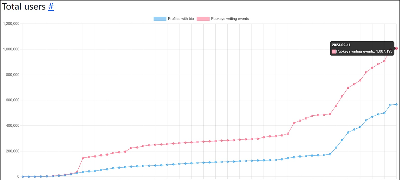 据 Nostr.Band 数据显示,去中心化社交协议 Nostr 账户数已突破 100 万,其中在主页设置个人简介的账户数接近 57 万。历史数据显示,2 月 1 日 Nostr 协议第三方客户端 Damus 发布后账户数为 558,188 个,这意味着自 Damus 发布至今 Nostr 协议账户数已增长近一倍。