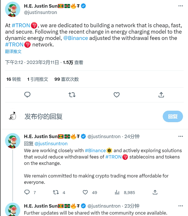 据官方消息,2月11日,波场TRON创始人、火必Huobi全球顾问委员会成员孙宇晨发推表示,“波场TRON致力于构建一个廉价、快速和安全的网络。随着近期波场TRON能源收费模式向动态能源模式的转变,Binance调整了波场TRON网络的提币费用。目前波场TRON正在与Binance密切合作,并积极探索可以降低波场TRON稳定币和交易所代币提币费用的解决方案。” “我们仍然致力于让每个人都能负担得起加密货币交易,一旦可用,将与社区共享进一步的更新。”孙宇晨强调。
