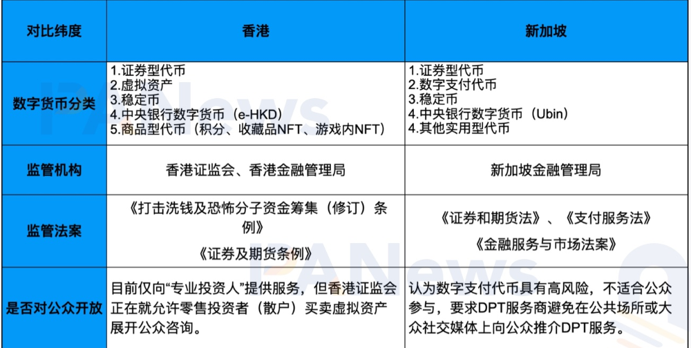 对比新加坡和香港的数字货币监管政策,在稳定币监管方面,新加坡和香港有很多共同之处,一方面他们都是将其作为数字支付代币或虚拟资产来监管,另一方面新加坡和香港都采取了进一步的措施来监管稳定币,香港将可能结合《支付系统及储值支付工具条例》来进行监管,新加坡打算在《支付服务法》(PSA)下面增加针对稳定币的监管条款。为方便读者进一步了解新加坡和香港的监管政策区别,本文选取PANews整理的一张香港和新加坡的加密监管政策对比图: