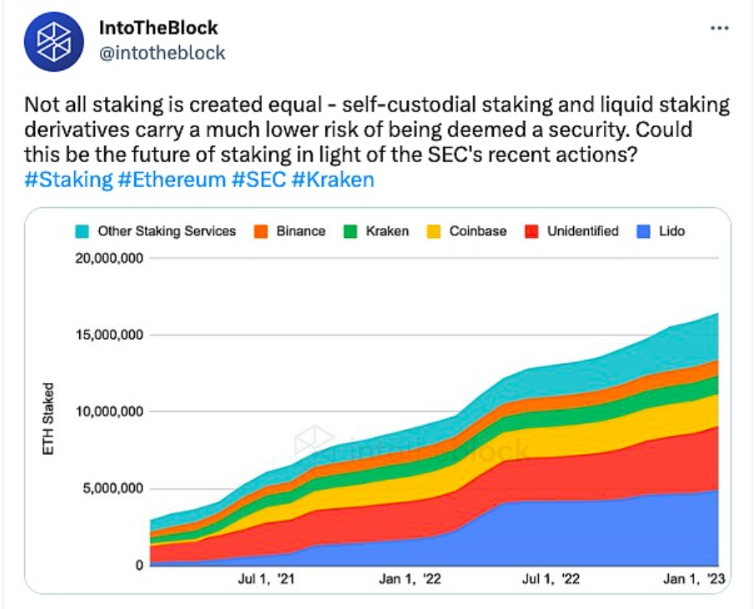 加密货币分析平台IntoTheBlock表示,并非所有质押都是平等的,自我托管质押和流动性质押衍生品被视为证券的风险要低得多。鉴于美国证券交易委员会最近的行动,这会是赌注的未来吗?
