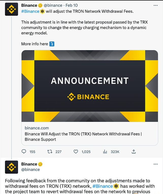 Binance宣布将调整TRON网络取款费用恢复到之前的水平。本次调整符合TRX社区最新通过的将能量计费机制改为动态能量模型的提案。 金色财经2月10日报道,据币安官方公告,币安将调整TRON(TRX)网络提现手续费。