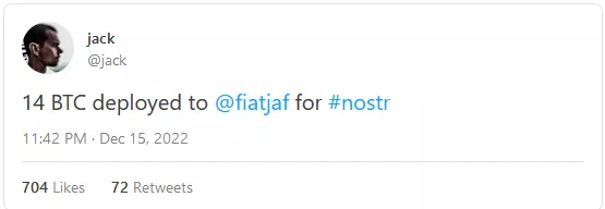 Jack 曾向 Nostr 捐赠 14 BTC | Twitter