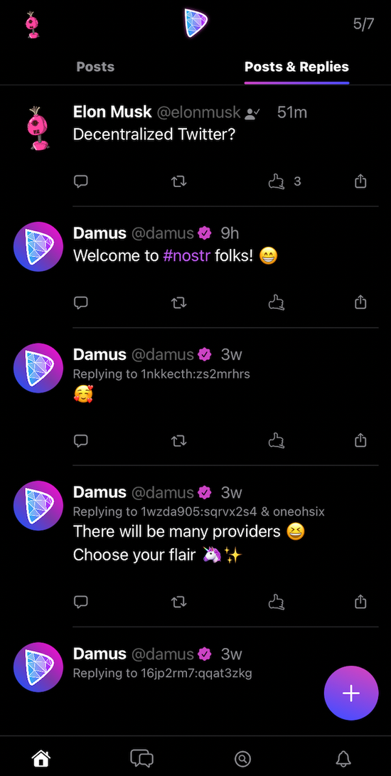 从 App 的界面布局来看,Damus 与 Twitter 极其类似,包括主页、私信、搜索&广场、通知四个底栏 Tab。点击页面右下角的「加号」就能发布内容,但是目前 Damus 只能直接发布文字内容,图片内容只有通过相关网站将图片转化为链接才能上传。